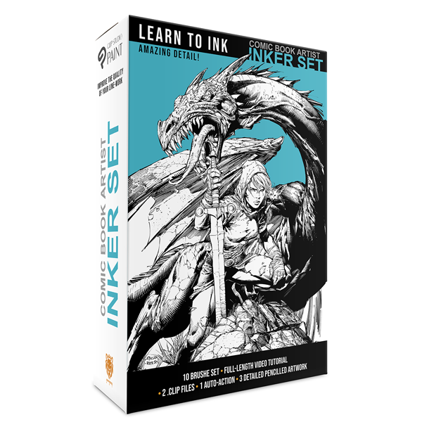 The FIRST Digital Inking Kit for Clip Studio Paint contains digital versions of the same tools used by traditional inkers and a tips and techniques video (in real-time) of professional comic book inker Jimmy Reyes's inking process.